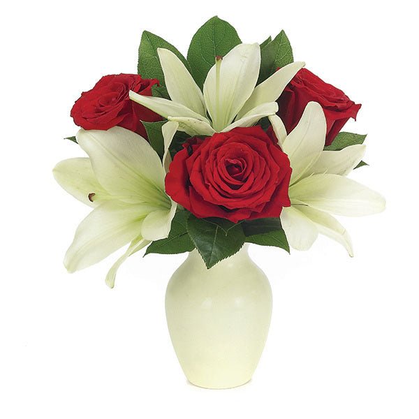 Impart a message of love that will tug on the emotions of someone special in your life. This gorgeous combination of Asiatic lilies and roses in a cream bud vase says it all, from your heart to theirs.