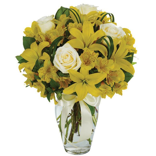 Brilliantly colorful, this collection of yellow Asiatic lilies, white roses and yellow alstroemeria in a clear urn vase is sure to make a wide array of remembrances shine bright. Complementing the look is a gracious white satin ribbon.