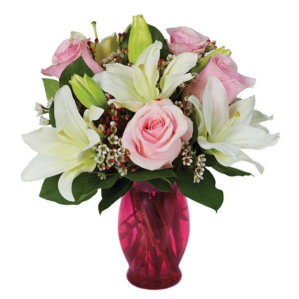 Three of the prettiest floral varieties youll find…white Asiatic lilies, light pink roses and white waxflower…collaborate wondrously in this exquisite bouquet captured in a clear fluted vase.