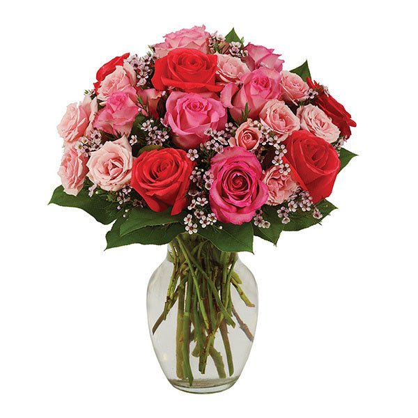 Convey the sweetest of emotions as your recipient gleefully sets their eyes on this glorious bouquet filled with pink roses in various shades, complemented by pink waxflower…all in a pretty rose vase.