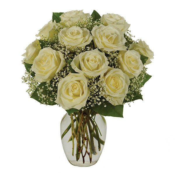 Sophisticated beauty has perhaps never been conveyed so distinctly. Stately white roses and gypsophila are arranged artfully in a clear rose vase to create a look of pure elegance.