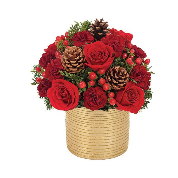 The exceptionally bright colors, the artistic shape, the overall look of incomparable floral magnificenceit’s all here and much more in this holiday bouquet that is certain to be treasured by every recipient. Roses, mini carnations, hypericum, pine cones and holiday foliage are skillfully arranged in a gold glass cylinder.