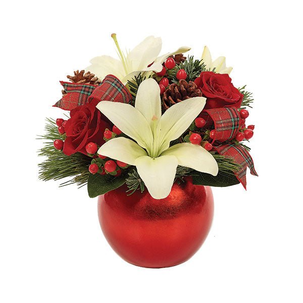 Deck the halls, the mantel, the tablethe entire housewith this vividly colorful arrangement of Asiatic lilies, roses and hypericum. Pine cones, a holiday plaid ribbon and a cheery red foil ball planter add just the right finishing touches.
