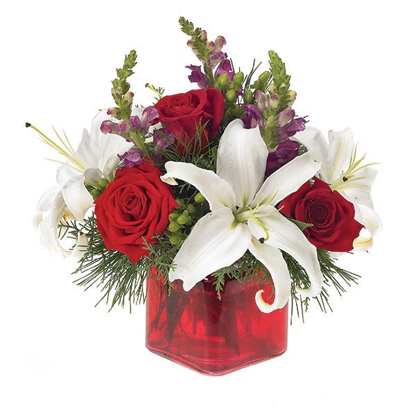 Convey the spirit of the season in an unforgettable way with this superbly crafted assortment of red roses, white lilies, burgundy snapdragons and green hypericum in an eye-catching red cube vase.