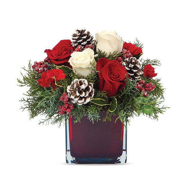 This holiday season is sure to be very cheerful and merry for the lucky recipient of this exquisite arrangement of roses, mini carnations and Christmas greens in a ruby square vase. Making the look even more special are faux red berries and white frosted pine cones.