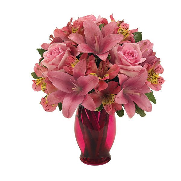 An array of thankful emotions will overcome Mom when see receives this beautiful arrangement of pink Asiatic lilies, light pink roses and pink alstroemeria in a pink fluted vase.